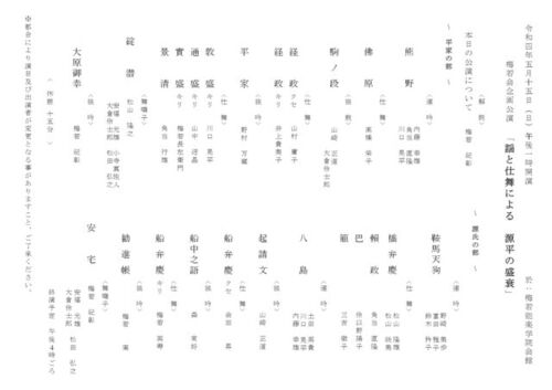 5/15(日)13:00(開場 12:00) 梅若会 企画公演 「謡と仕舞による 源平の盛衰」 場所:梅若能楽学院会館 一昨年のトライアル公演「晩秋の調べ」に続く、照明や音響による演出を伴う企画公演・第二弾となります。 今回は数多の能の題材となっている源氏と…