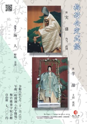 7/21(日)13:00(開場 12:00) 梅若会定式能 場所:梅若能楽学院会館 舞囃子 海人:野崎美歩、一噌隆之、大山容子、柿原光博、梶谷英樹 能 実盛:角当直隆、福王和幸、金田弘明、一噌隆之、飯田清一、原岡一之、梶谷英樹 地謡…梅若紀彰、松山隆雄、山崎正…