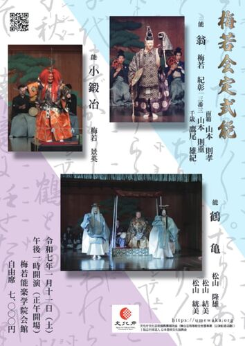 1/11(土)13:00(開場 12:00) 梅若会定式能 場所:梅若能楽学院会館 翁:梅若紀彰、山本則重、鷹尾雄紀、山本則孝、竹市学、飯富孔明、田邊恭資、清水和音、亀井広忠 地謡…山崎正道、梅若基徳、梅若雄一郎、内藤幸雄、土田英貴 後見…山中カが晶、川口晃平…