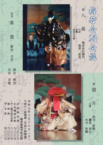 3/16(日)11:00(開場 10:00) 梅若会別会能 場所:梅若能楽学院会館 能 八島 弓流 素働 奈須与市語:梅若長左衛門、梅若景英、副王和幸、内藤連、藤田貴寛、大倉源次郎、國川純 地謡…小田切康陽、梅若基徳、山中ガ晶、山村庸子、内藤幸雄、小田切亮磨、…