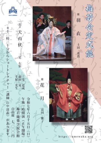 6/15(日)13:00(開場 12:00) 梅若会定式能 場所:梅若能楽学院会館 ※開演前12:30より、ショートレクチャーがございます ショートレクチャー:山中ガ晶 仕舞 蝉丸 道行:鈴木矜子 鵜飼 キリ:三好徹子 地謡…伶以野陽子、高橋栄子、井上貴美子、角田勝美 …